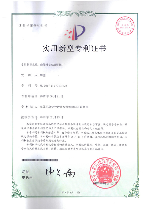 專(zhuān)利證書(shū)功能性訓(xùn)練服面料